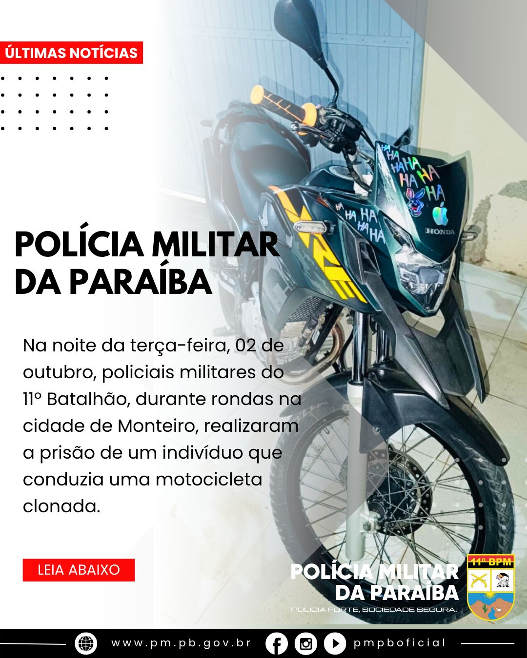 Na noite da terça-feira, 02 de outubro, por volta das 23h20min, policiais militares do 11º Batalhão, durante rondas na cidade de Monteiro, realizaram a prisão de um indivíduo que conduzia uma motocicleta clonada.