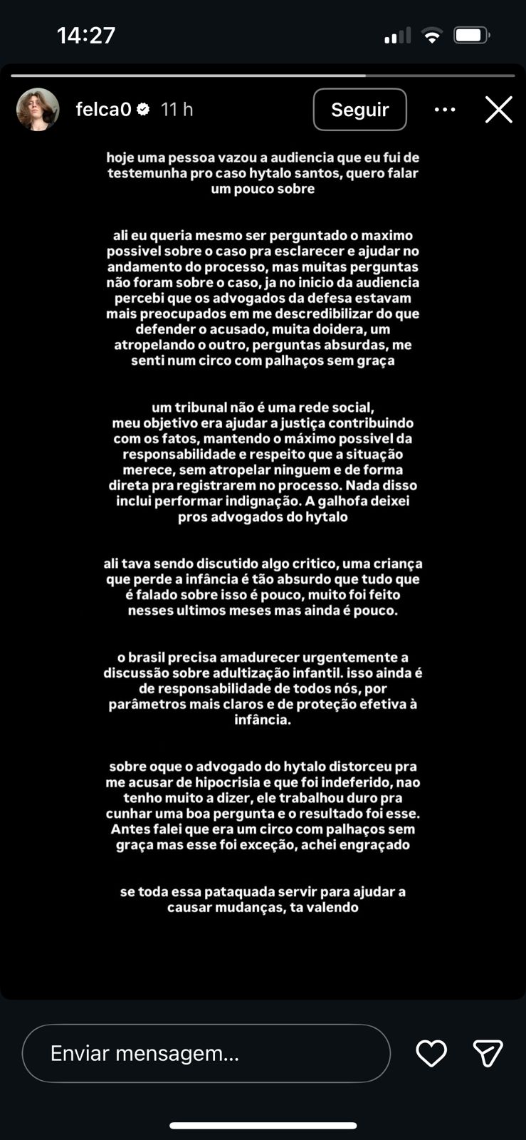 No texto, Felca afirmou que estava na audiência para esclarecer e ajudar ao máximo no andamento do processo, mas que perguntas não eram sobre o caso. “Um atropelado o outro, perguntas absurdas”, citou. Ele ressaltou que o ambiente do tribunal não era uma rede sociais e que estava lá com “o máximo possível de responsabilidade e respeito”.