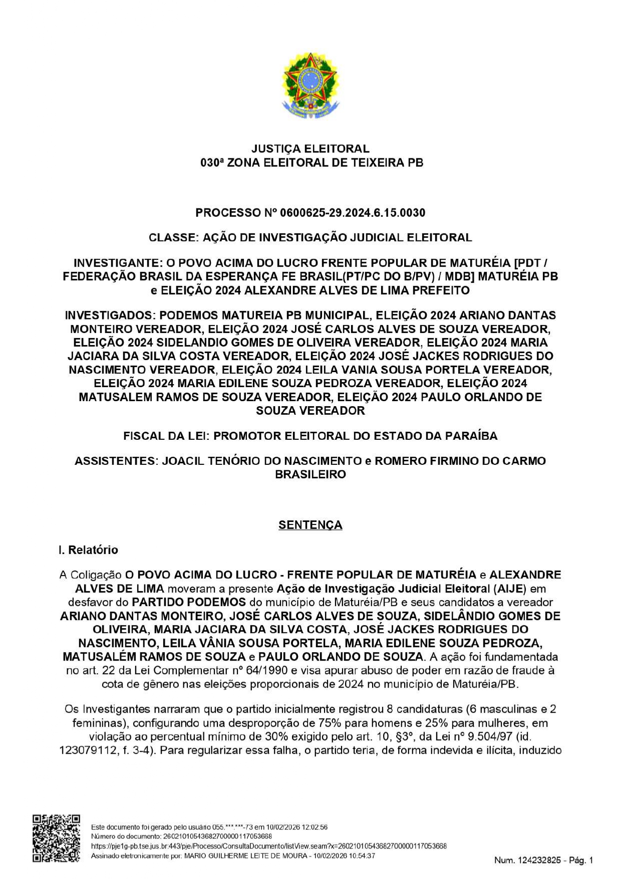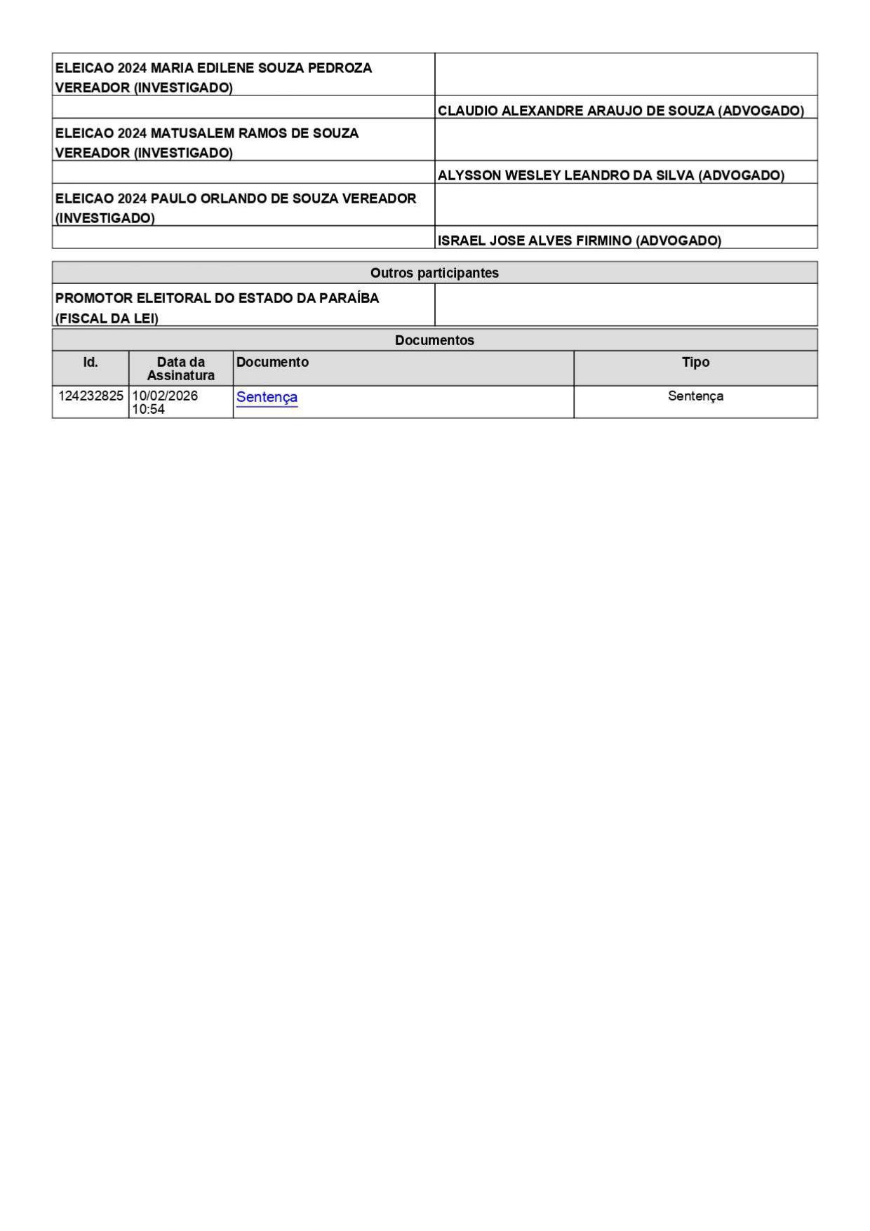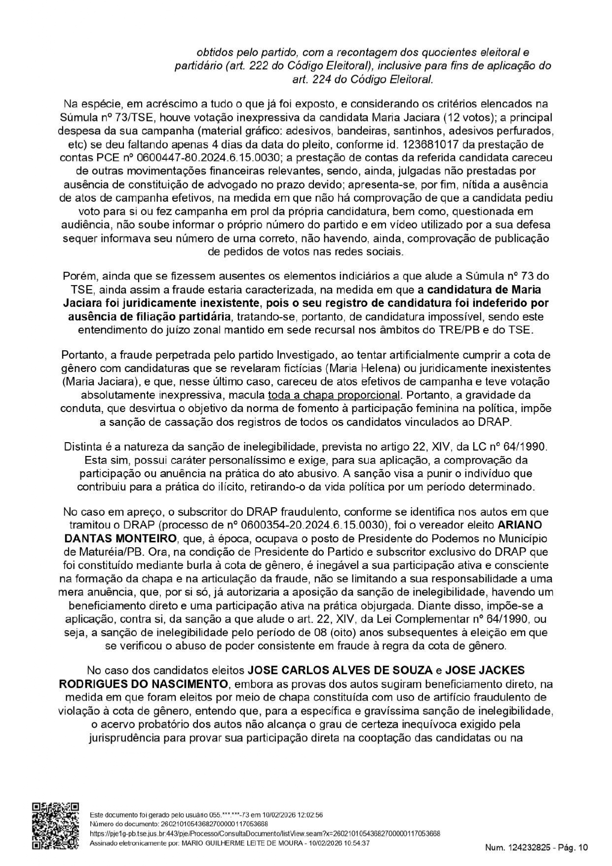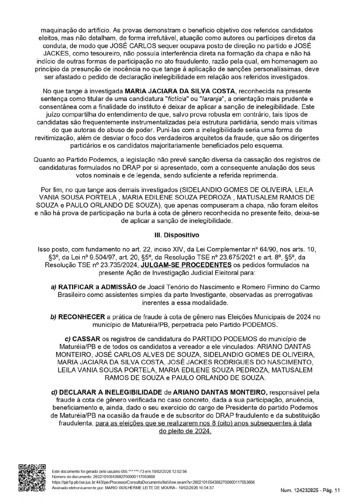 Apenas o vereador Ariano Dantas Monteiro passou a ser considerado inelegível pois, segundo consta no processo, ele foi “responsável pela fraude à cota de gênero verificada no caso concreto, dada a sua participação, anuência. beneficiamento e, ainda, dado o seu exercício do cargo de Presidente do partido Podemos de Maturéia/PB na ocasião da fraude e de subscritor do DRAP fraudulento e da substituição fraudulenta, para as eleicões que se realizarem nos 8 (oito) anos subsequentes à data do pleito de 2024”.
