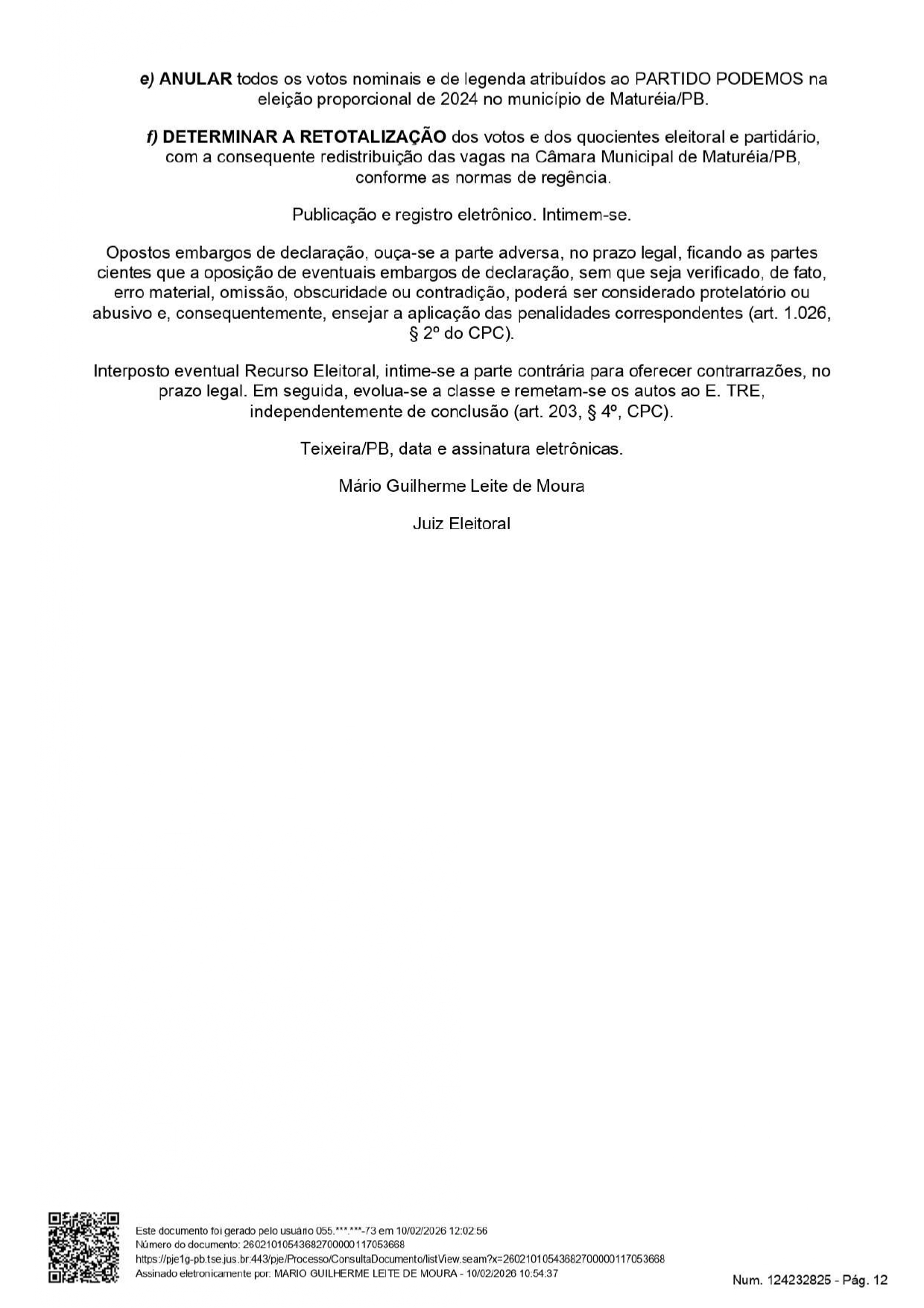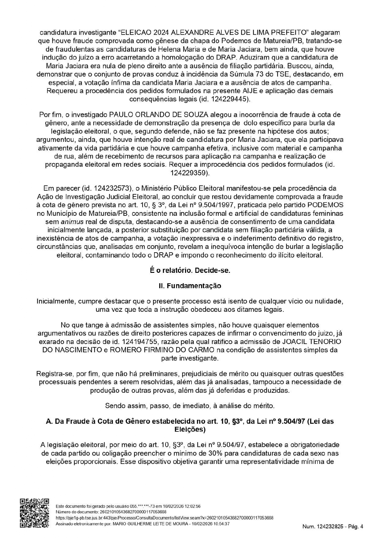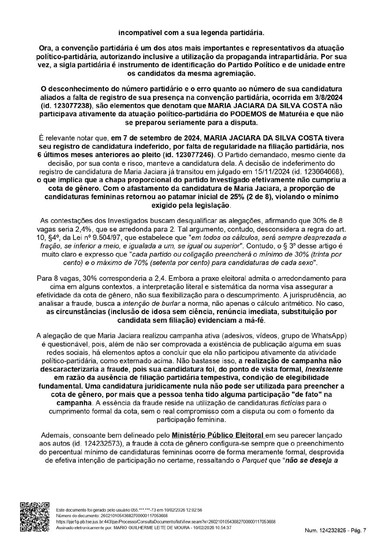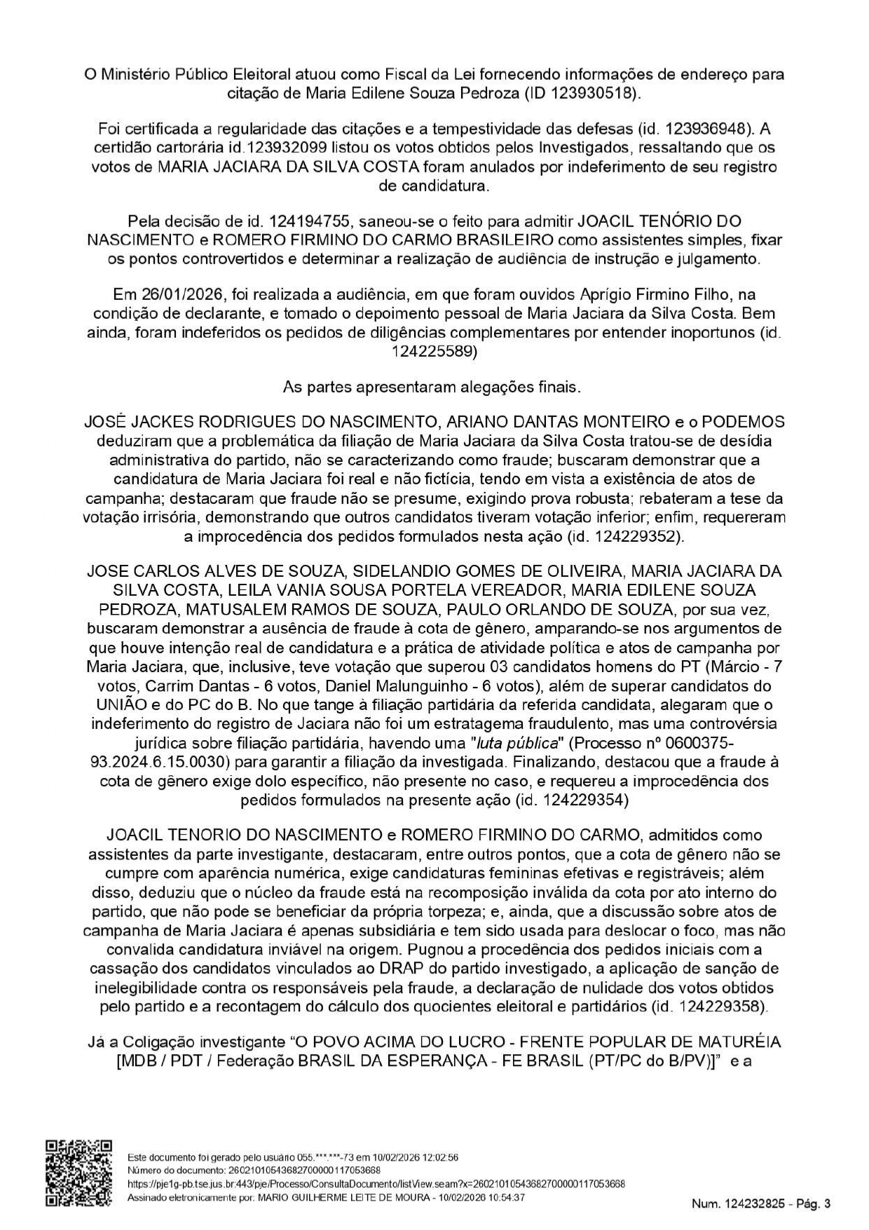 Apenas o vereador Ariano Dantas Monteiro passou a ser considerado inelegível pois, segundo consta no processo, ele foi “responsável pela fraude à cota de gênero verificada no caso concreto, dada a sua participação, anuência. beneficiamento e, ainda, dado o seu exercício do cargo de Presidente do partido Podemos de Maturéia/PB na ocasião da fraude e de subscritor do DRAP fraudulento e da substituição fraudulenta, para as eleicões que se realizarem nos 8 (oito) anos subsequentes à data do pleito de 2024”.