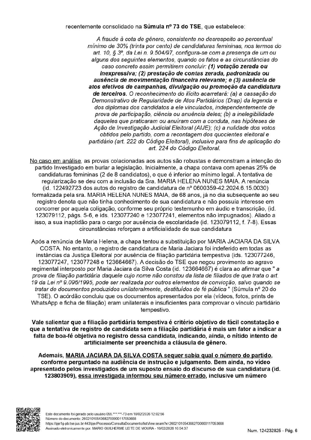 “Maria Jaciara da Silva Costa sequer sabia qual era o número do partido, conforme perguntado na audiência de instrução e julgamento. Bem ainda, no vídeo apresentado pelos investigados de um suposto ensaio do discurso de sua candidatura, essa investigada informou seu número errado, inclusive um número incompatível com a sua legenda partidária” consta no processo.