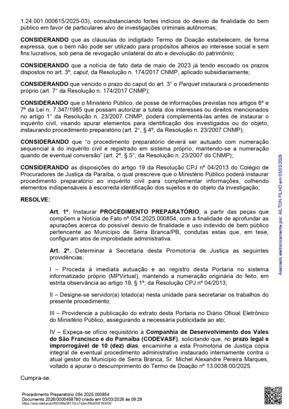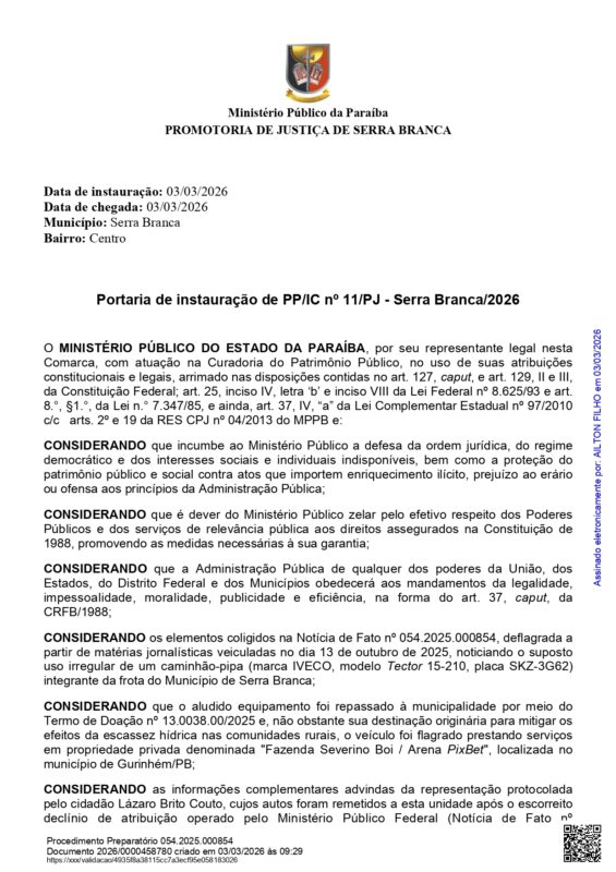 O Ministério Público da Paraíba (MPPB) instaurou procedimento preparatório para investigar o possível uso irregular de um caminhão-pipa pertencente à frota do Município de Serra Branca, no Cariri paraibano. A portaria foi assinada pelo promotor de Justiça Ailton Nunes Melo Filho nesta terça-feira, 3 de março.